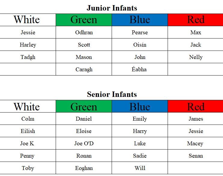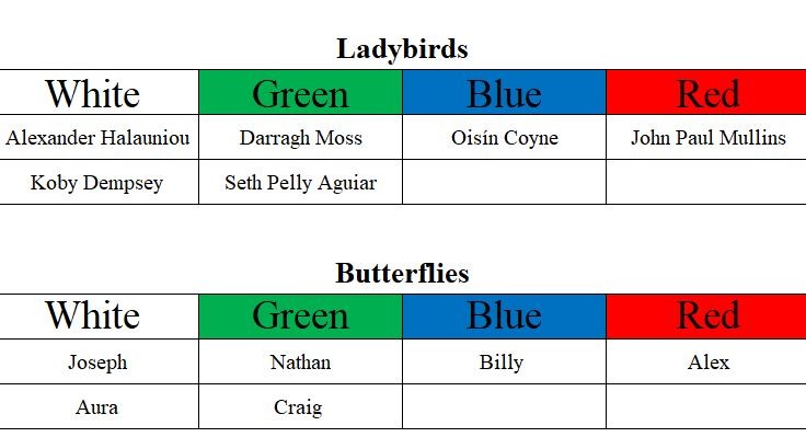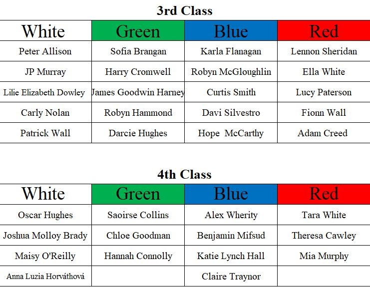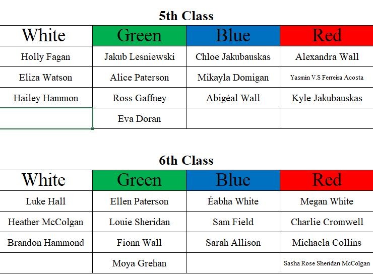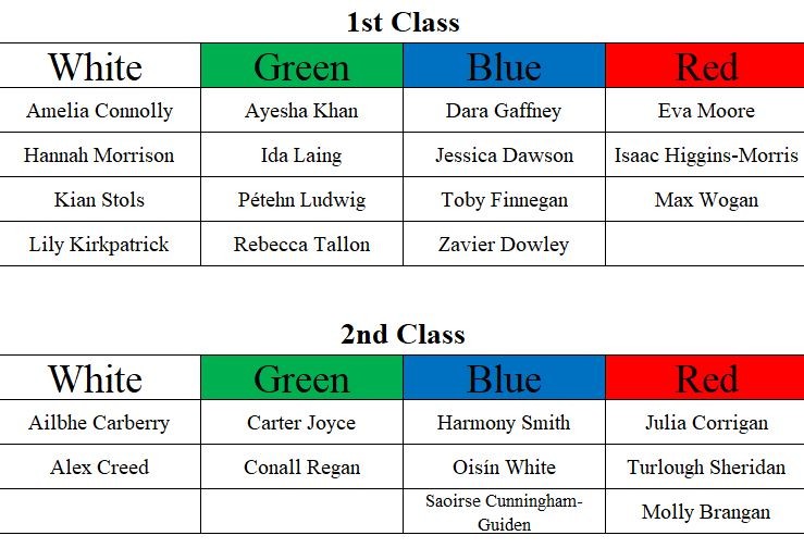 Every class will be divided up into four coloured teams – White, Green, Blue and Red.