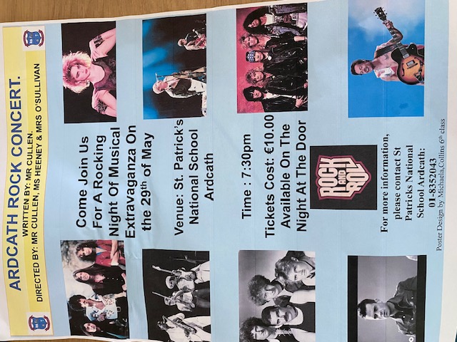 Congratulations to Michaela Collins for designing a very informative and colourful poster to advertise our upcoming night of musical extravaganza. Weeks of hard work and rehearsing by the students of St. Patrick’s N.S. will culminate in a concert on Thursday, 29th May. No doubt our school hall will be packed to the rafters with parents, pupils and guests for a hugely enjoyable two hours of music, featuring music from Oasis, Madonna, Queen, Robbie Williams and lots more!
