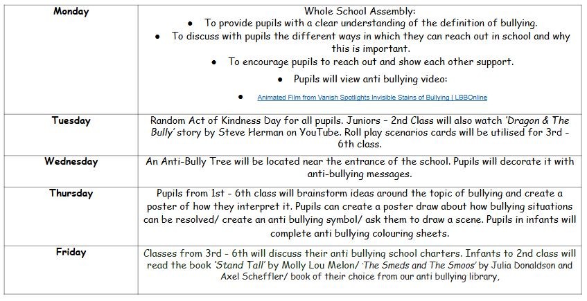 Our school is currently reviewing our Anti-Bullying policy to ensure it fully complies with the requirements of the ‘Bí Cineálta: Procedures to Prevent and Address Bullying Behaviour for Primary and Post-Primary Schools’. To date our progress is as follows: